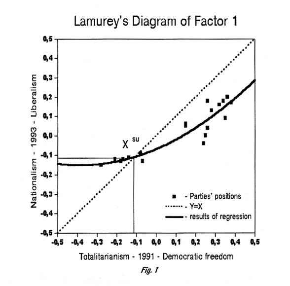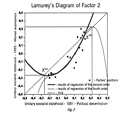 The positions of the parties are represented in the 2D space. The value for each party for a given factor in 1991 is represented on the X axis, and the value of that factor for 1993 is represented on the Y axis. For each factor there is a set of 20 points, one for each party. A regression curve was fit to these points for each factor.